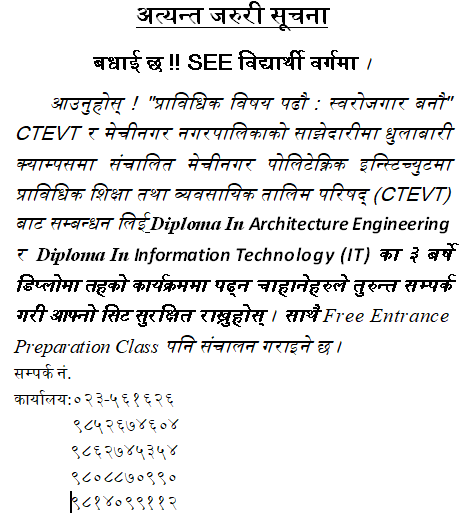 Mechinagar Polytechnic Institute is an institution run in Dhulabari campus in partnership with CTEVT and Mechinagar Municipality. Keeping in view the need of higher level of technical education in this area, to provide technical education at minimum fee, in association with Council for Technical Education and Vocational Training (CTEVT), Civil Engineering (Civil Engineering), Architecture Engineering (Architecture Engineering) and Information Technology (IT) ) will conduct 3 programs of 3-year diploma level. There is a 48/48 student quota in these three programs. Technical Education S.L.C within Mechinagar Municipality. The establishment of Mechinagar Polytechnic Institute has given an opportunity to study diploma level, as only level programs are running.